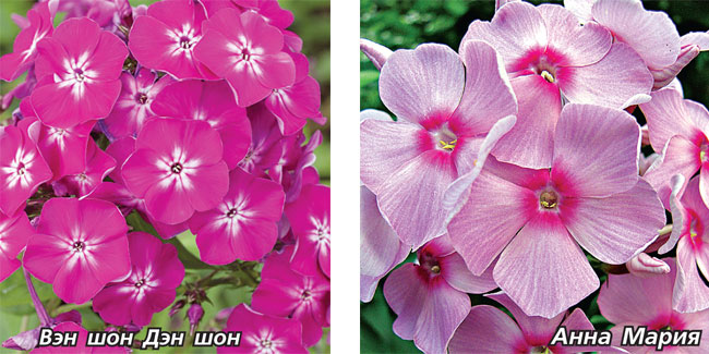 Следующая группа по выразитель-ности - розовые флоксы. Здесь два ва-рианта: сочетается нежно-розовый тон лепестков с более темным колечком; либо ярко-розовые лепестки с белой звездочкой или глазком. Это сорта Ав-густин, Народный, Радомир, Россиянка, Сказка, Юннат, Анна Мария, Милый Друг, Уральские Сказы, Фламинго, Розовая мечта, Мисс Пеппер (Miss Pepper), Alexandra (Александра), Bright Eyes (Брайт Айс), Baby Face (Беби Фейс) и др.