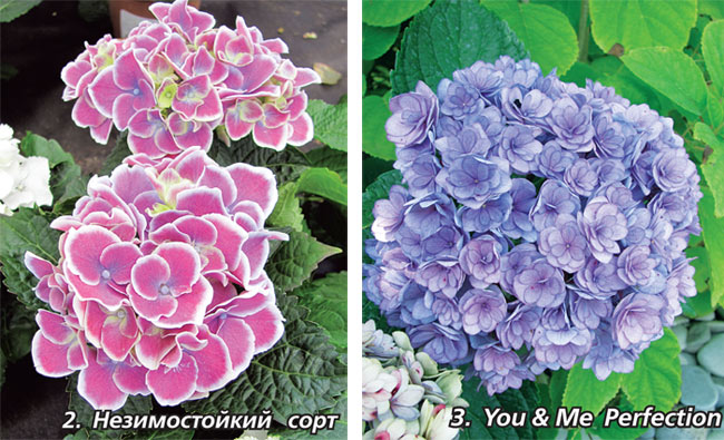 Например, сорт You & Me Perfection ­ крупнолистная гортензия с плотными махровыми соцветиями, которые могут быть как розовыми, так и голубыми в зависимости от кислотности почвы и удобрений (фото 3, 4).