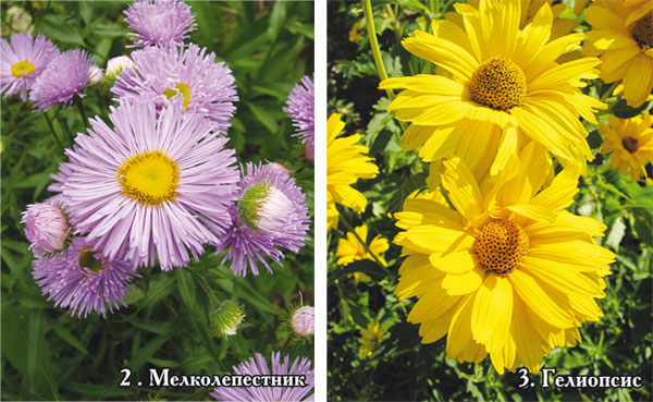 Симпатичные цветки распускает мелколепестник красивый, или эригерон (Erigeron speciosus). Его часто путают с многолетней астрой, а любители называют голубой ромашкой. Он цветет в середине лета и имеет несколько сортов с разными оттенками лилово-сиреневого цвета (фото 2). Взрослый куст достигает 70 см и представляет собой пышный голубой букет. Это отличный партнер для желтого кореопсиса, который тоже напоминает ромашки.